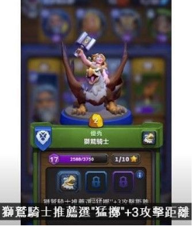 狮鹫骑士推荐选择"猛掷"天赋,增加3点攻击距离,使其在远程输出中更具优势。