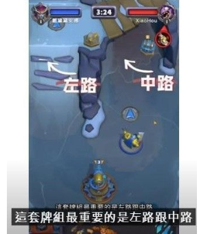 这套牌组重点聚焦左路和中路。起手阶段,在中路靠右位置部署近战强盗,争取开锁获取4元金币。同时,将弗丁部署在靠左位置,靠近敌方宝箱,确保其能及时接战并吸收伤害。随后,在左路部署远程单位如狮鹫骑士和猎手,并调整方向使左路部队经由桥面穿越中路。远程单位在桥上可攻击桥下的中路目标,形成高低差优势。